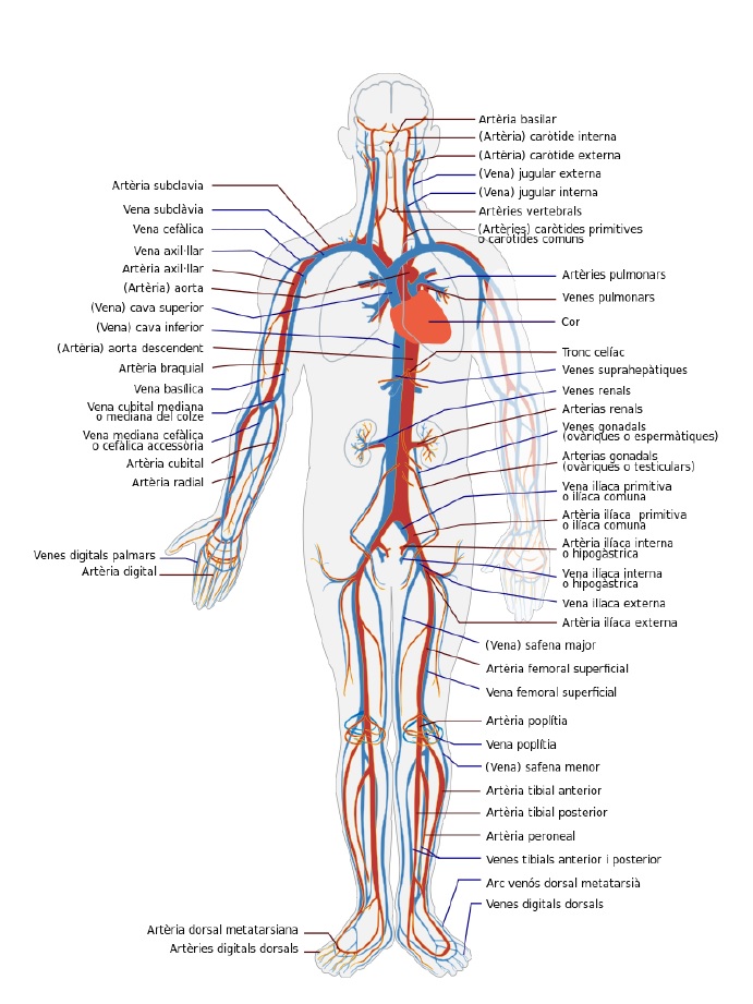Completa làmina imprimible amb les venes i artèries del sistema circulatori.