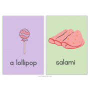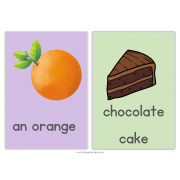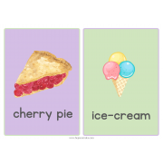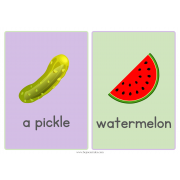 Flashcards imprimibles en color para juegos con vocabulario de la historia The Very Hungry Caterpillar.