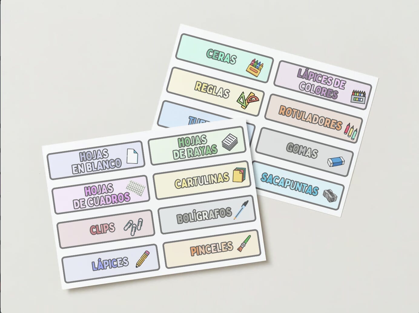 Etiquetas para clasificar y organizar el material de aula.