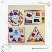 En aquest PDF trobaràs 4 cartells de les 4 figures geomètriques més bàsiques (quadrat, cercla, triangle i rectangle). Cada cartell té la forma de la figura geomètrica corresponent i dibuixos de formes iguals.