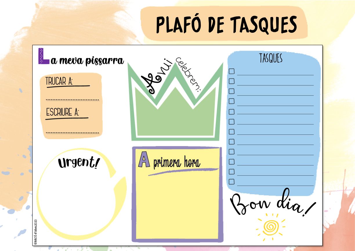 Plafó per plastificar i anotar tasques importants del dia. Amb una funda d’arxivador, també, el rotulador vileda s’esborra fantàsticament.