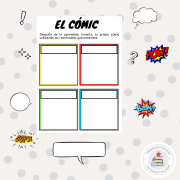 TRABAJAR EL CÓMIC. Son dos recursos: el primero para trabajar la estructura del cómic (es un imprimible de A3 para hacer un puzzle de las partes del cómic) y, en segundo lugar, tenemos una plantilla para realizar un taller de escritura creativa con recortables.