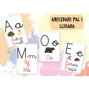 Làmines A4 amb les lletres de l’abecedari, en lletra de pal i lletra lligada per a penjar.