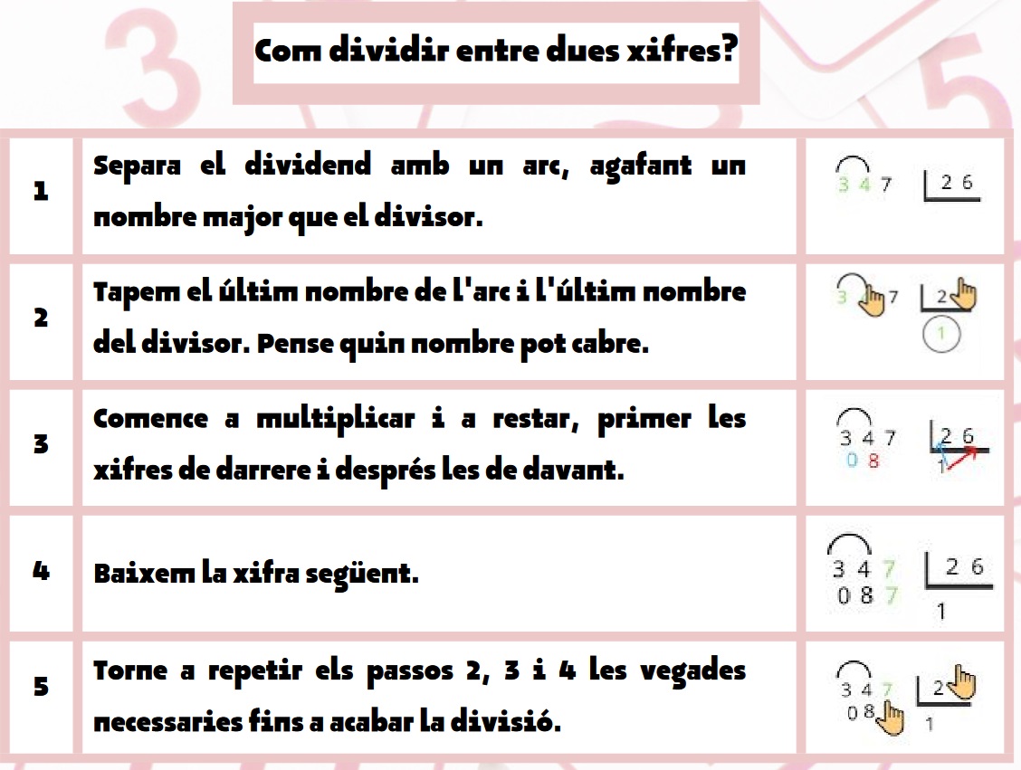 Fitxa amb instruccions i exemples per a realizar les divisions de dues xifres amb números naturals.