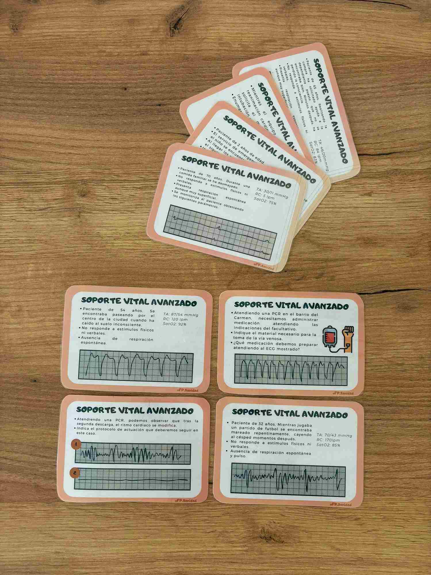 Entre las competencias de los técnicos y técnicas en emergencias sanitarias se incluye la prestación de ayuda en la aplicación de técnicas de soporte vital avanzado por parte del personal facultativo. Para trabajar este contenido de la forma más práctica posible, se han diseñado una serie de tarjetas que muestran posibles situaciones de SVA. Estas tarjetas pueden utilizarse realizando simulacros en pequeños grupos, donde el alumnado tiene que realizar el protocolo o protocolos que corresponde a la situación planteada.