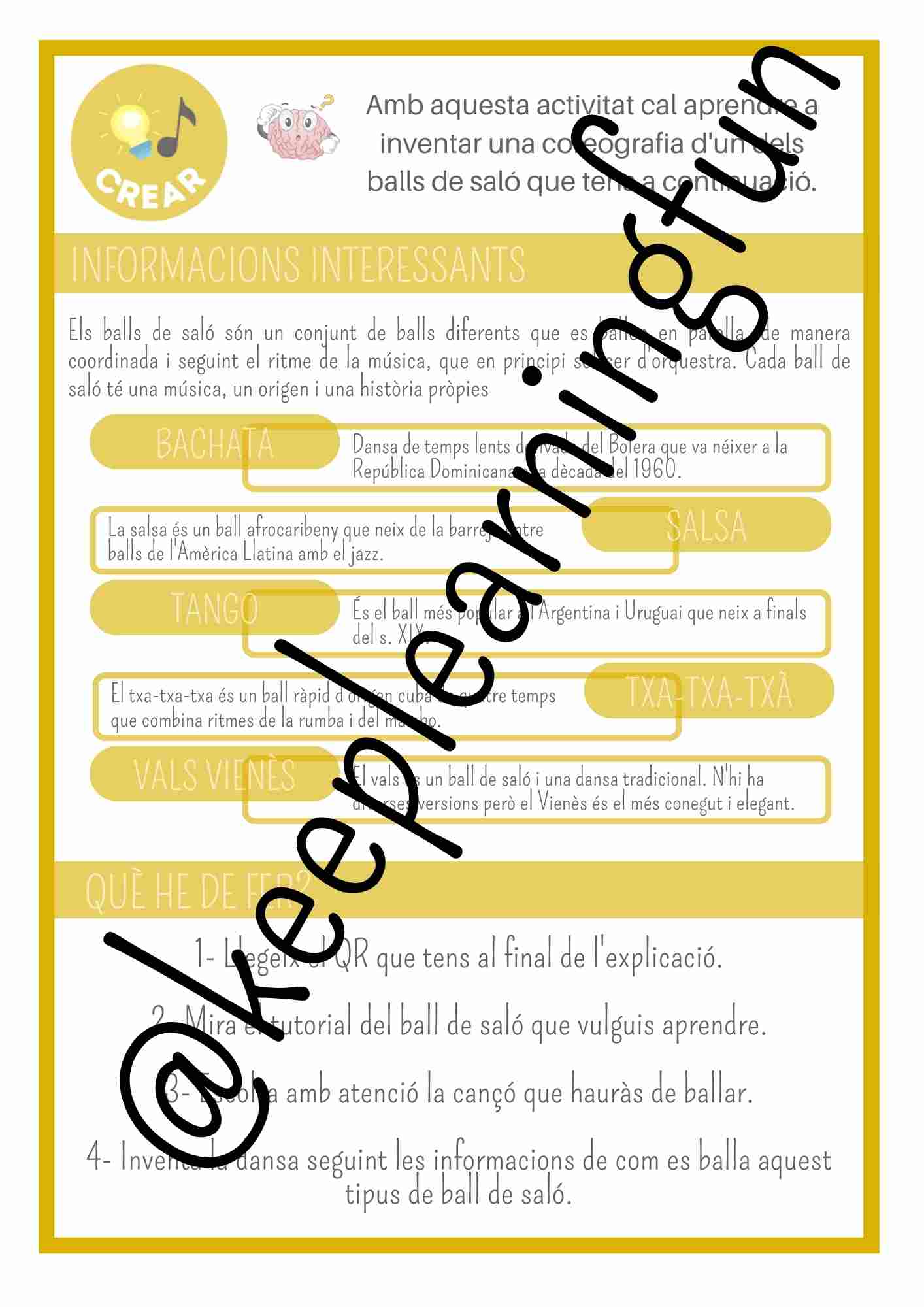 Fitxes per a propostes autònomes de dansa sobre balls de saló i dansa contemporània. Disposa d¡informació del tipus de dansa i d'exemples amb formats QR en videos de Youtube.