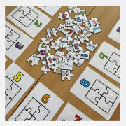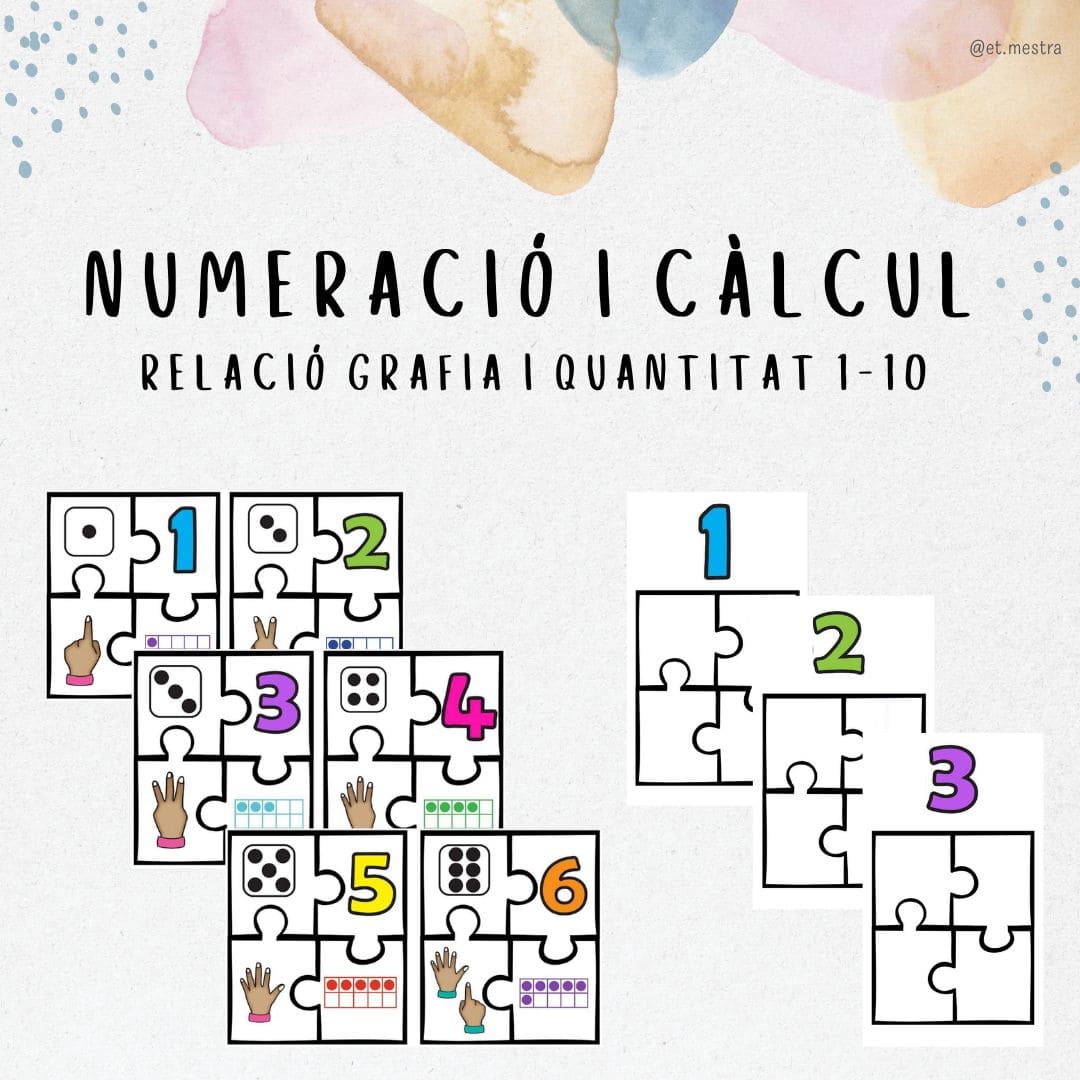 Trencaclosques gegant que permet treballar la relació entre grafia i quantitat de manera manipulativa. Inclou el nombre, la representació de la grafia, la representació en un dau i la representació amb les mans. A més, s’ha elaborat una plantilla per cada nombre on s’ha d’enganxar amb velcro les diferents peces per poder treballar l’orientació espacial amb l’alumnat.