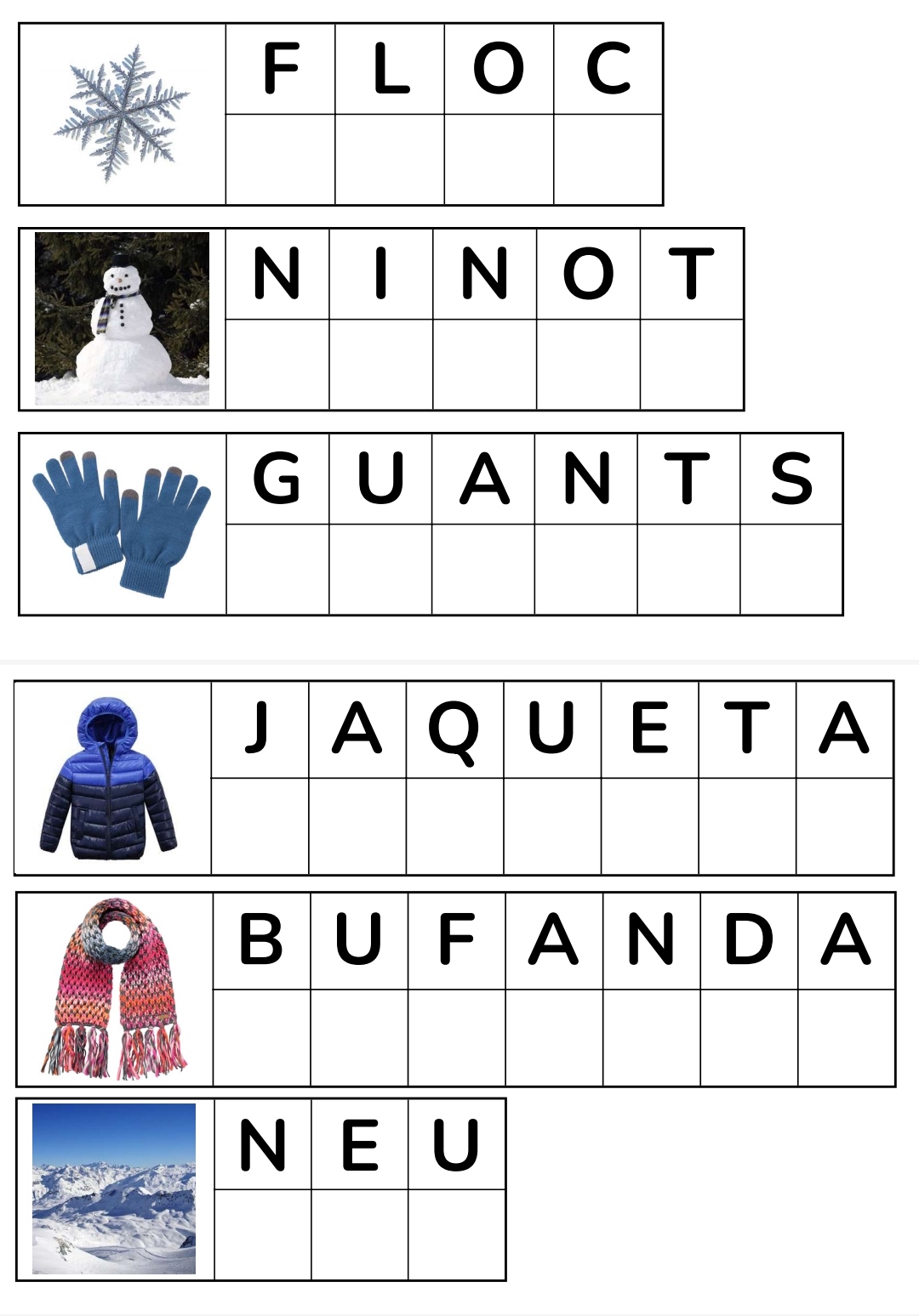 Treball de la lectoescriptura a partir de vocabulari de l'hivern. 12 paraules amb imatge.