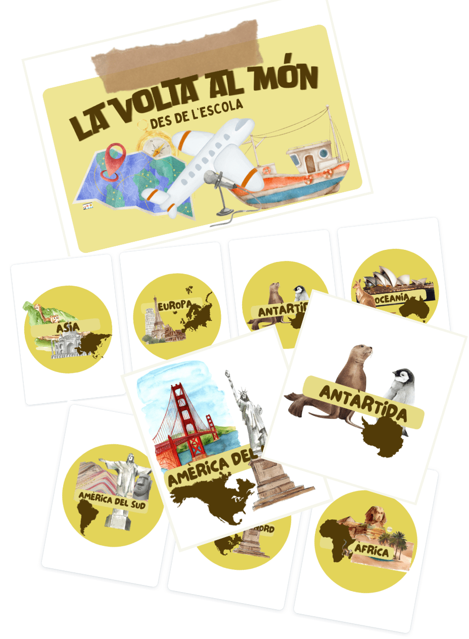 Cartelleria sobre els continents i la volta al món. Visual per tal de tenir-ho present a l'aula, i poder fer línea del temps o guía de viatge :)