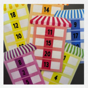 Material manipulatiu per treballar el nombre anterior i posterior fins al 30. Conté 10 edificis amb diferents nivells: primer només els números de l’1 al 10; després del 10-20; del 20 al 30; i, finalment, quatre edificis amb tots els números barrejats.