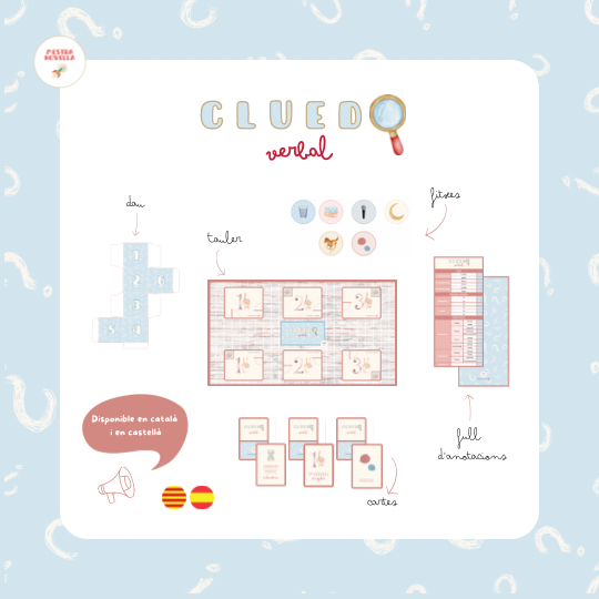 Es tracta d'un ✨CLUEDO VERBAL✨. És com el joc del Cluedo tradicional de tota la vida, però, en comptes d'esbrinar amb la nostra capacitat de deducció la persona, l'arma i el lloc de l'homicidi, hem d'esbrinar quin verb ha desaparegut, dient la persona, el nombre, el temps verbal i el verb! Conté: